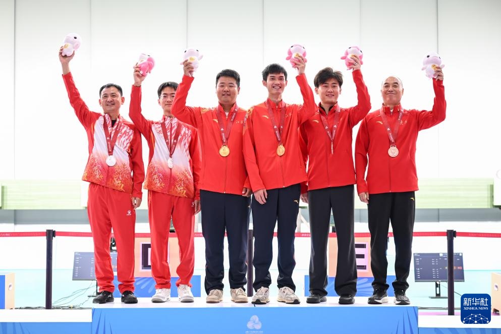 10月14日,冠军江苏队选手盛李豪右三)、亚军吉林队选手王雨桐左二)、季军陕西队选手刘宇坤右二)及教练在颁奖仪式上。当日,第十五届全运会射击男子10米气步枪决赛在广州举行。新华社记者 丁磊 摄10月1