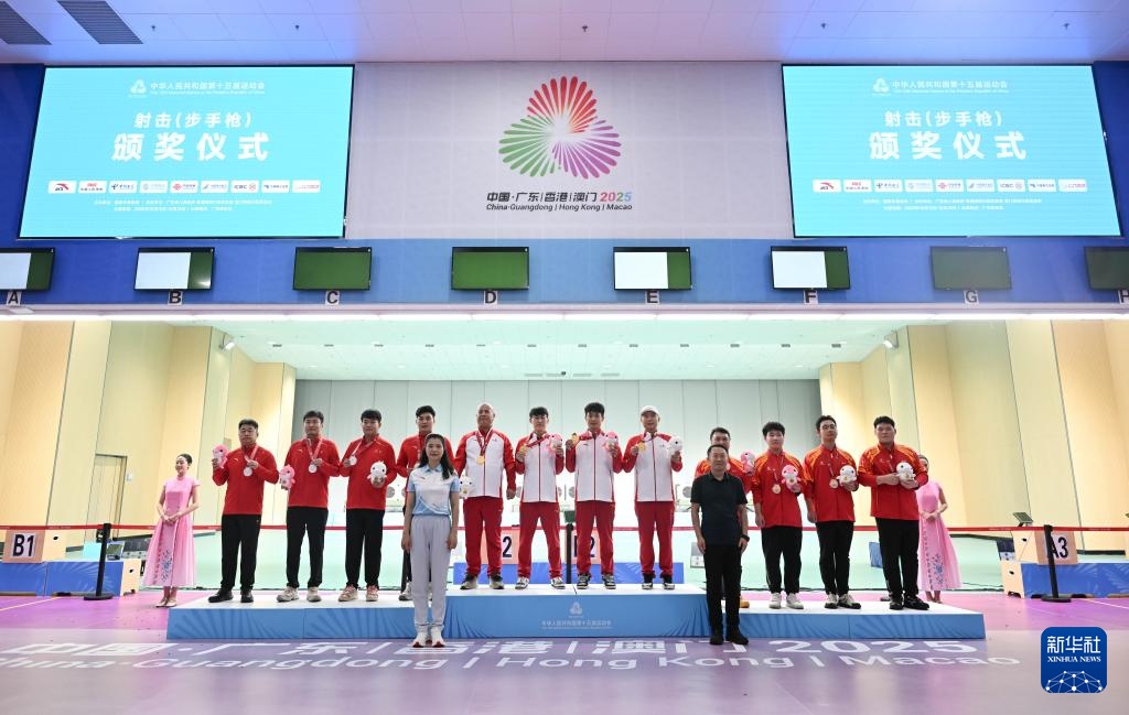 10月14日,冠军山东队中)、亚军陕西队左)、季军江西队在颁奖仪式上合影。当日,第十五届全运会男子25米手枪速射团体决赛在广州举行。新华社记者 邓华 摄10月14日,冠军山东队选手李越宏、刘帅、倪志欣